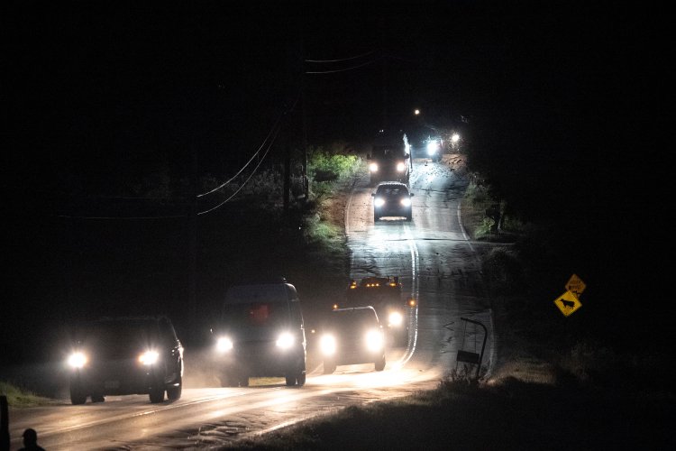 Police vehicles leave the scene near the Card family farm along Meadow Road in Bowdoin on Thursday evening. Armored vehicles and SWAT teams were staged further up the road where load explosions like flash bombs could be heard earlier in the evening. Gregory Rec/Staff Photographer