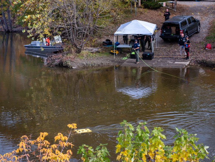 Members of the Maine State Police Underwater Recovery Team use a ROV to search the Sabattus River on Friday afternoon at Miller Park in Lisbon. Russ Dillingham/Sun Journal