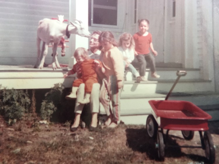 Snow the Goat with his human family some 50 years ago. Courtesy of Kay Wheeler