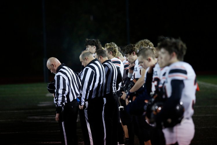 Players and officials observe a moment of silence for the victims of a mass shooting in Lewiston prior to Monday’s Yarmouth-Brunswick football playoff game. Derek Davis / Portland Press Herald