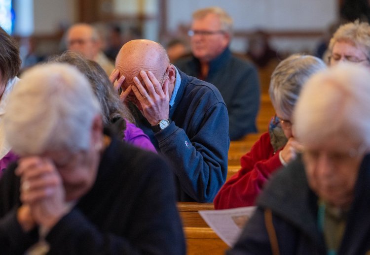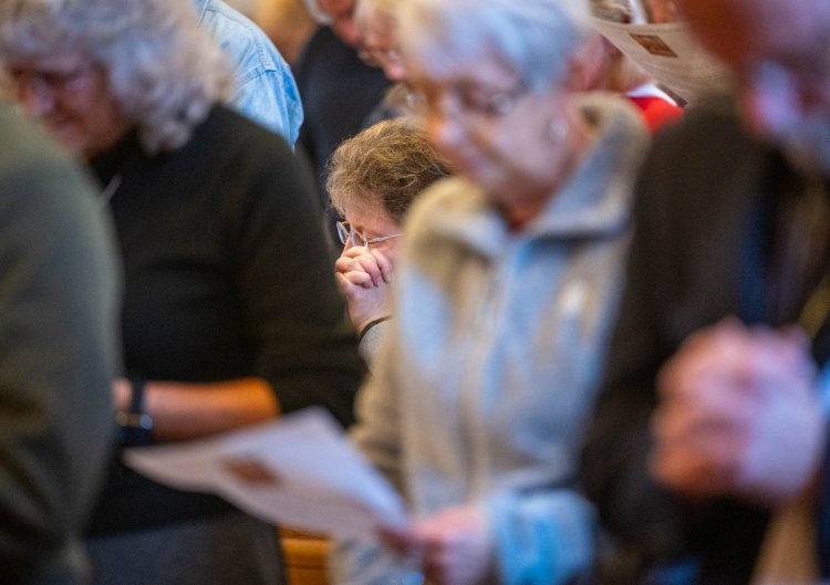 Parishioners pray Sunday afternoon during a service at Holy Family Church in Lewiston for the victims of the Oct. 25 killings. Andree Kehn/Sun Journal