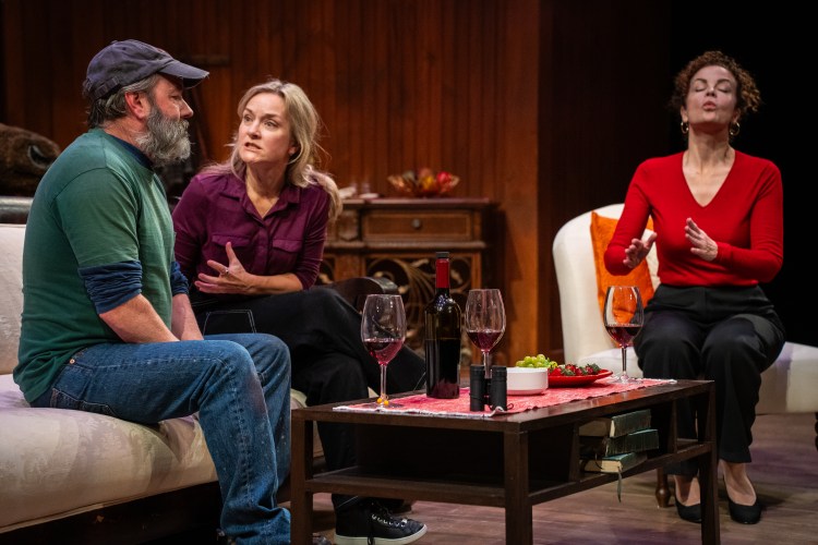 Liam Craig, Jenny Woodward and Pilar Witherspoon in “Saint Dad” at Portland Stage. Photo by James Hadley/courtesy of Portland Stage