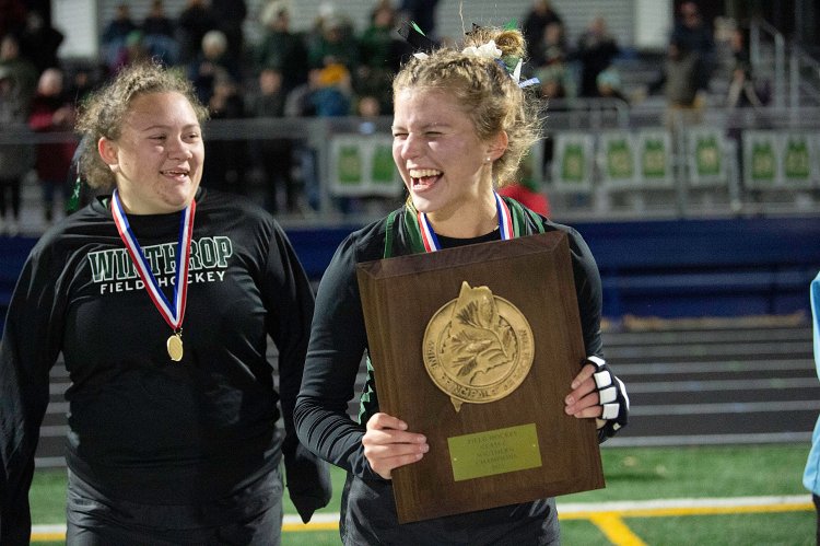 Izzy Folsom of Winthrop carries the championship plaque Thursday after the Ramblers beat Spruce Mountain 2-0 in the Class C South field hockey final at Fryeburg. Daryn Slover/Sun Journal