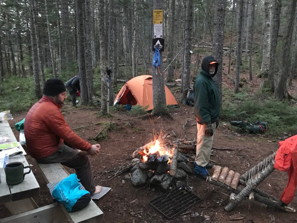 Each day we walked slowly and looked around a lot, stopping to enjoy every viewpoint. We leaned on our trekking poles to shoot the bull. We ate frequently from overloaded food bags. We pitched comfortable camps at Little Moose Pond and Big Notch Pond, turned picnic tables into open bars, and gathered lots of wood and lazed around blazing fires.