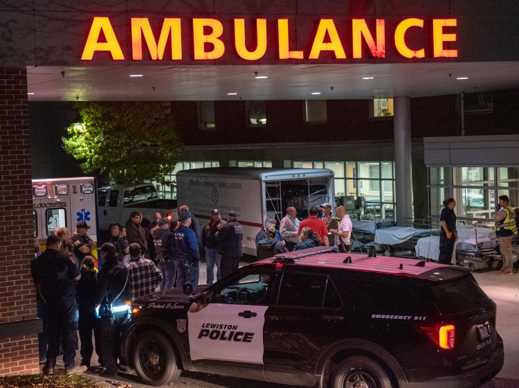 Emergency responders and police gather at the emergency entrance at Central Maine Medical Center in Lewiston on Oct. 25 after the deadly mass shooting at Just-In Time bowling alley and Schemengees Bar & Grille in Lewiston. Russ Dillingham/Sun Journal file