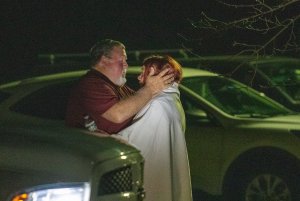 A man and woman embrace at the reunification center shortly after midnight early Oct. 26 at Auburn Middle School in Auburn. Russ Dillingham/Sun Journal file