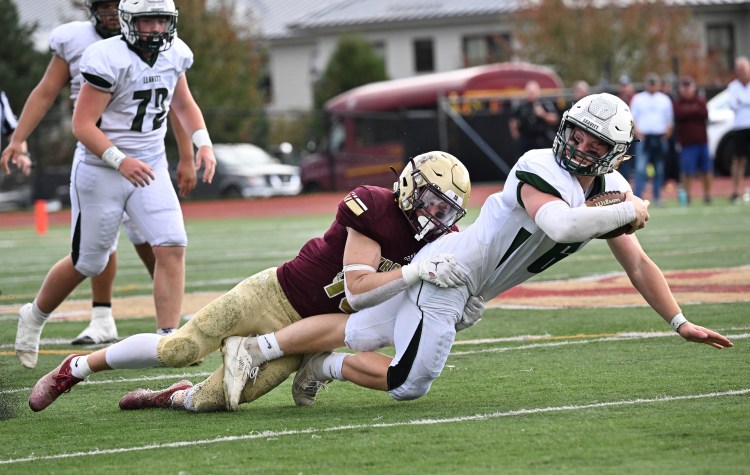 Thornton Academy senior Brady Kezal tackles Leavitt quarterback Noah Carpenter during a regular-season game on Oct. 14. Shawn Patrick Ouellette/Staff Photographer
