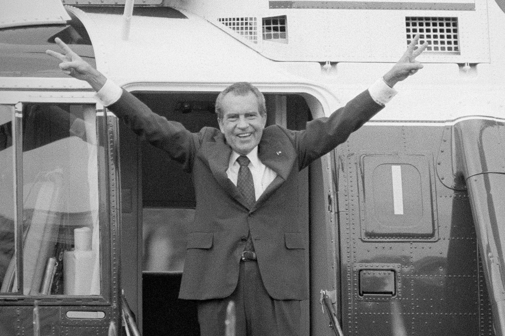 Richard Nixon says goodbye with a victorious salute to his staff members outside the White House as he boards a helicopter after resigning the presidency on Aug. 9, 1974. Bob Daugherty/Associated Press file