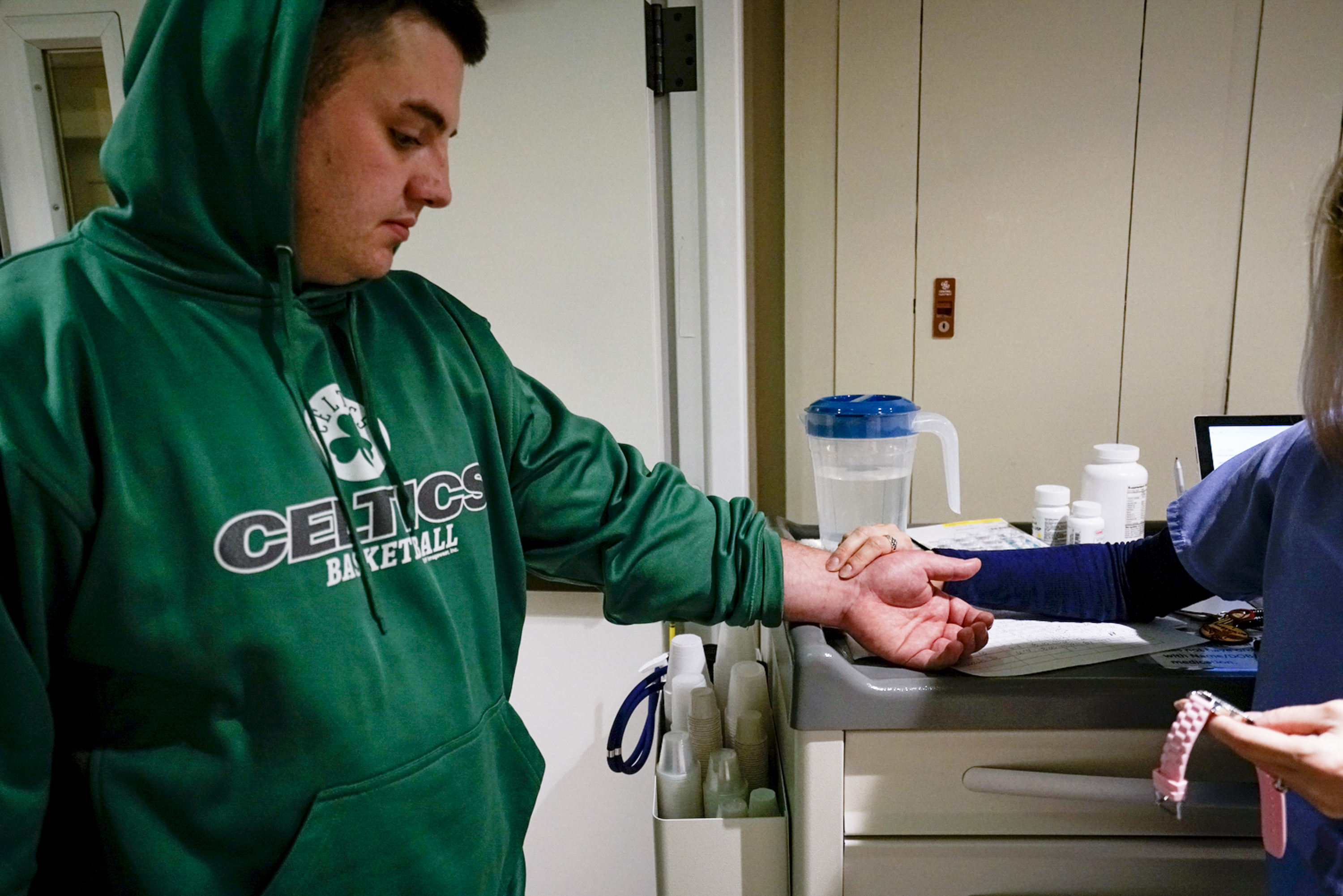 HAVERHILL, MA – JUNE 4: Stephen Barbour has his pulse checked by a nurse before receiving a dose of suboxone to help him detox from a heroin addiction at Serenity at Summit rehab center in Haverhill, Mass. The throws of detox were severe for Barbour, who had built a high tolerance to heroin and felt he wasn’t being given enough suboxone to help him combat the withdrawals. (Photo by Gabe Souza/Staff Photographer)