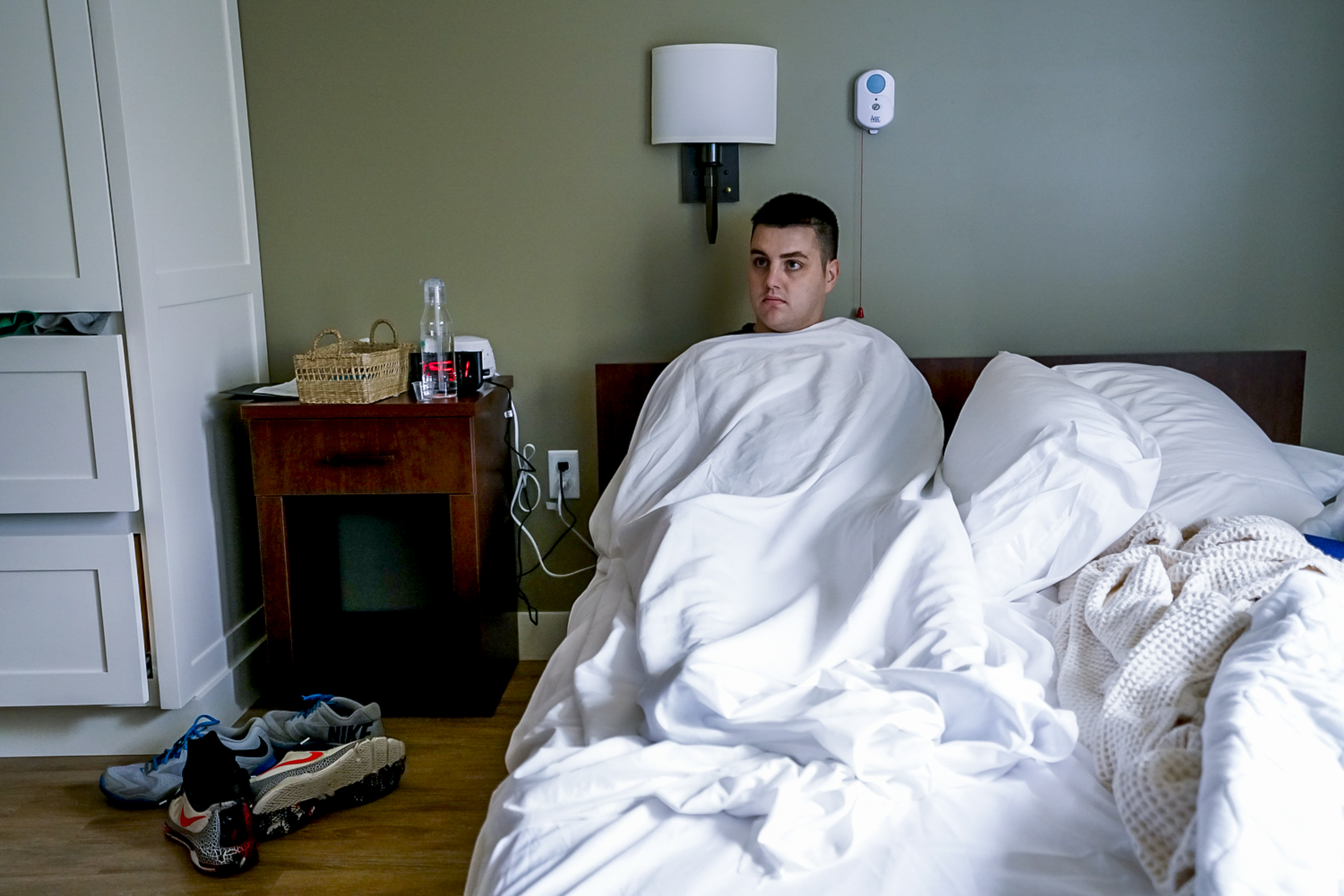 HAVERHILL, MA – JUNE 3: Stephen Barbour sits up, alert in bed, while going through detox at Serenity at Summit rehab center in Haverhill, Mass, Friday, June 3, 2016. The effects of detox were severe for Barbour, who had built a high tolerance for heroin. He felt he wasn’t being given enough suboxone to help him combat withdrawal symptoms. (Photo by Gabe Souza/Staff Photographer)