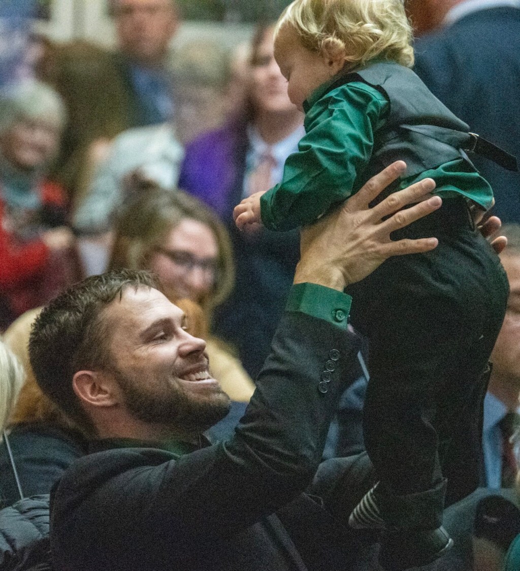 Rep. Travis Hasenfus, D-Readfield, plays with his son Grafton Hasenfus on the first day of the 131st Legislature Wednesday at the Maine State House in Augusta.
