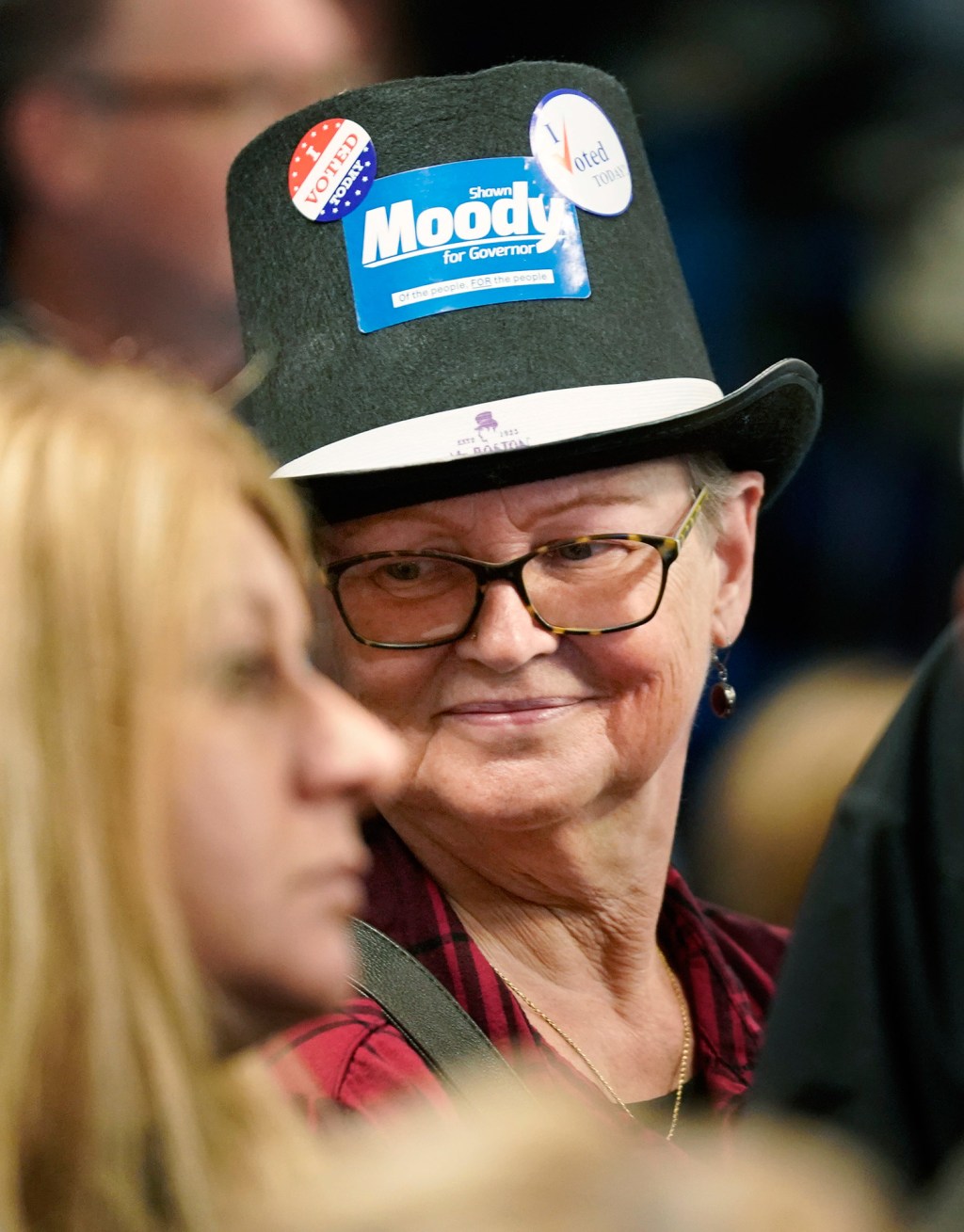 Dr. Regina Marsters of Gorham sports a hat with a Moody for Governor sticker while waiting for election results Tuesday night with other Moody supporters at Moody's Collision Center in Gorham.