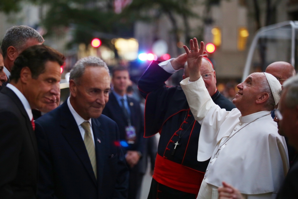 Francis waves to the crowd as he arrives at St. Patrick’s Cathedral, with Gov. Andrew Cuomo, left, and Sen. Charles Schumer, D-N.Y., waiting to greet him.