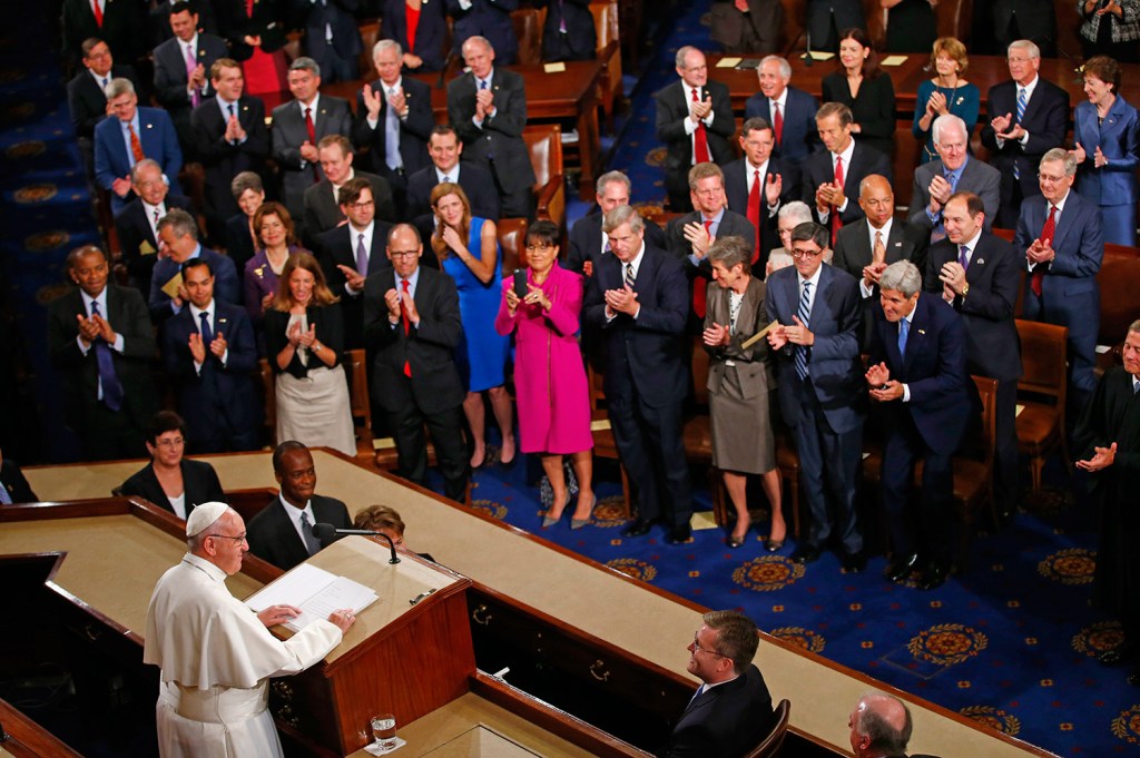 Pope Francis addresses a joint meeting of Congress on Capitol Hill in Washington. Listening behind the pope are Vice President Joe Biden and House Speaker John Boehner of Ohio.