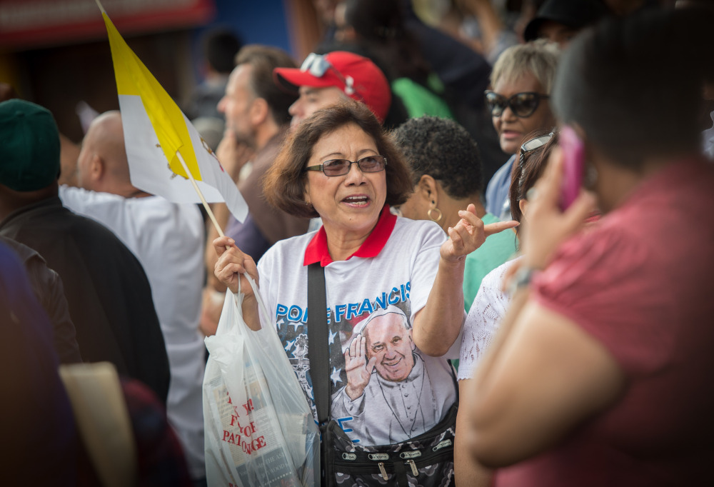 People line the sidewalk on Third Avenue in New York waiting for Pope Francis to arrive for a visit to Our Lady Queen of Angels School.