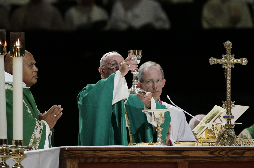 Pope Francis raises his chalice as he celebrates Mass at Madison Square Garden.