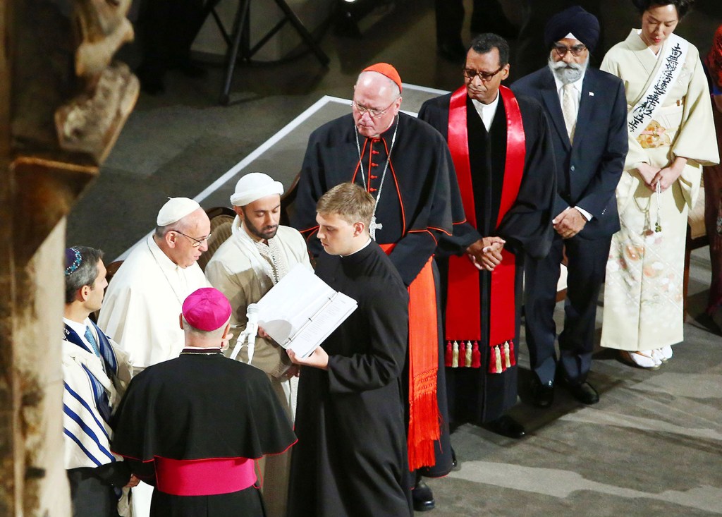 Pope Francis, second left, reads a passage during a multi-religious service at the 9/11 Museum in New York City. The Pope is on a two-day visit to New York which includes addressing the United Nations and holding mass at Madison Square Garden before heading to Philadelphia.