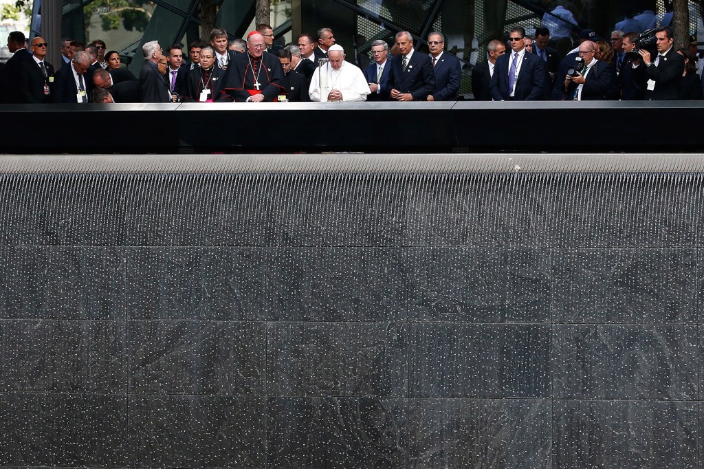 Pope Francis prays at the edge of the South Pool at the World Trade Center in New York.