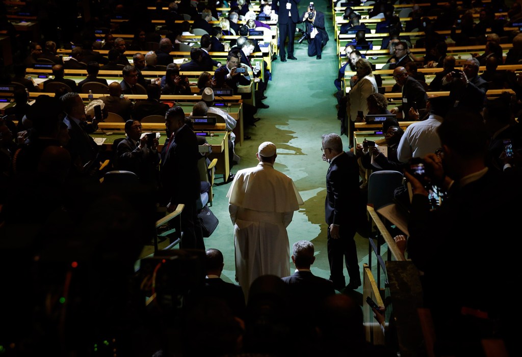 Pope Francis addresses the 70th session of the United Nations General Assembly Friday at United Nations headquarters.