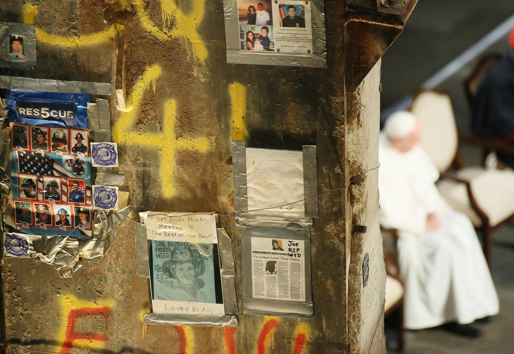Pope Francis attends a multi-religious service at the 9/11 Museum behind a massive steel column, damaged during the attacks of Sept. 11, 2001 in New York. Following the attacks the column was covered with photos and graffiti to remember lives lost.