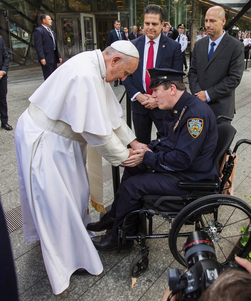 Pope Francis shakes hands with a New York City officer while visiting the 9/11 Memorial plaza on Friday in New York.