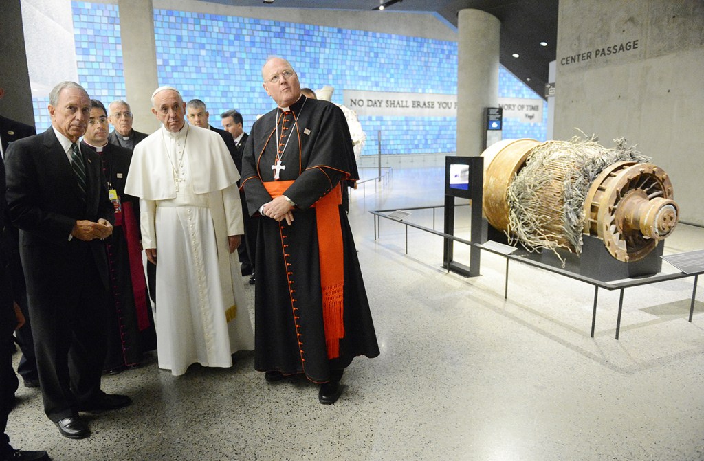Former New York Mayor Michael Bloomberg, left, Pope Francis, and Cardinal Timothy Dolan look at a segment of the radio and television antenna that was damaged in the attacks of Sept. 11, 2001, while visiting the 9/11 Museum in New York.