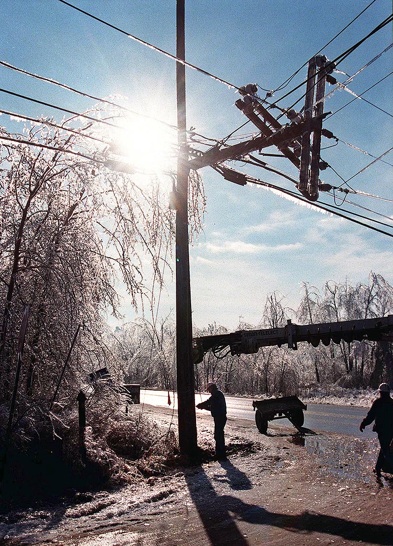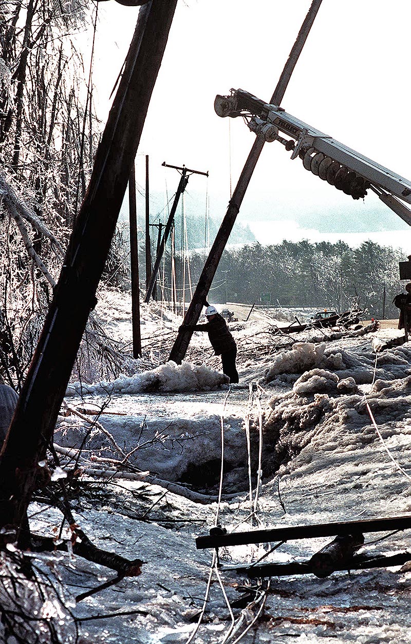 JAN. 10: A crew from Bell Atlantic replaces a telephone pole alongside Route 302 in Windham as the warming sun starts to melt the ice.