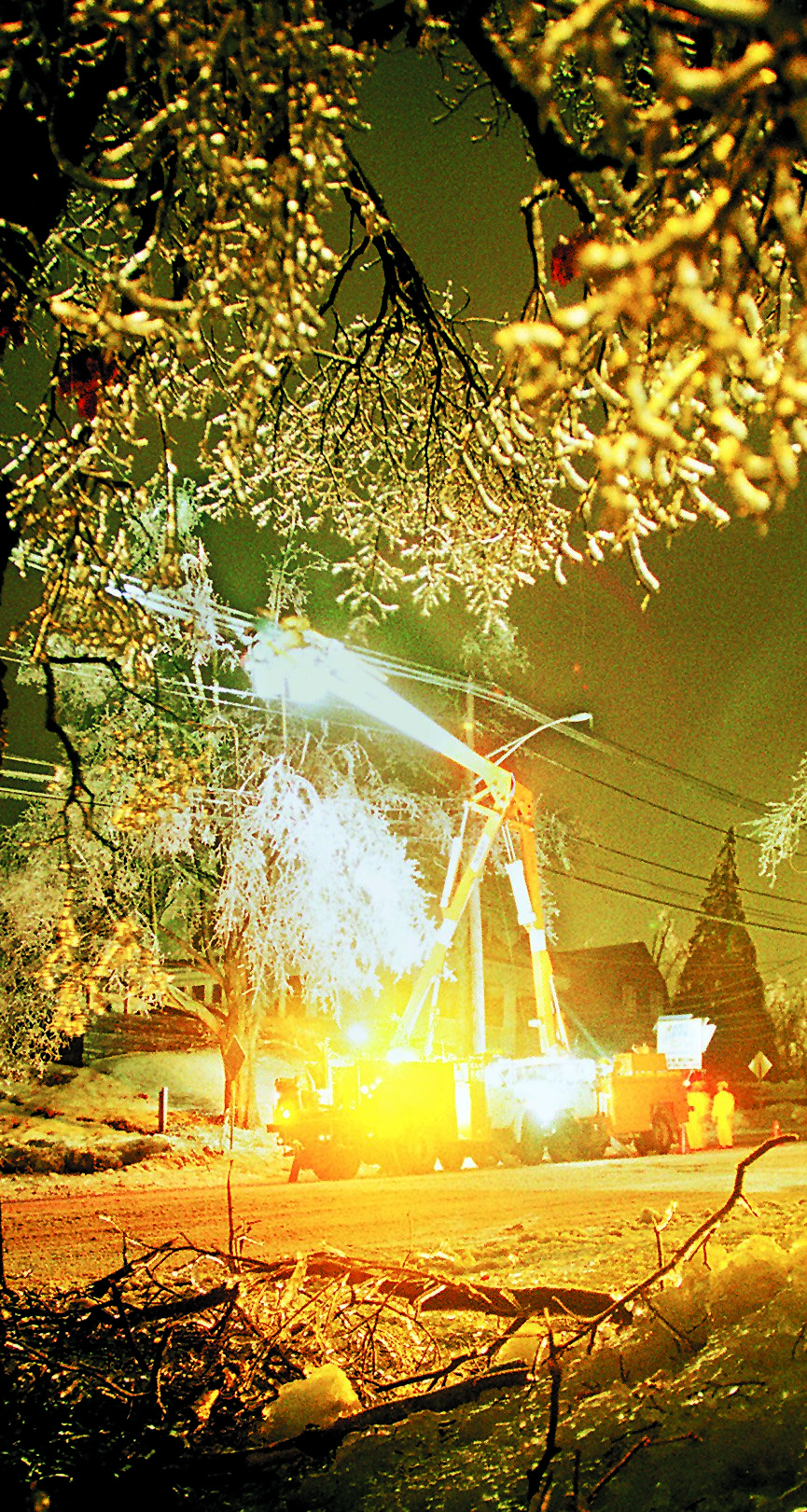 JAN. 9: Ice encrusted branches are cleared from power lines along South High Street in Bridgton as freezing rain and hail contributed to the load on the trees.