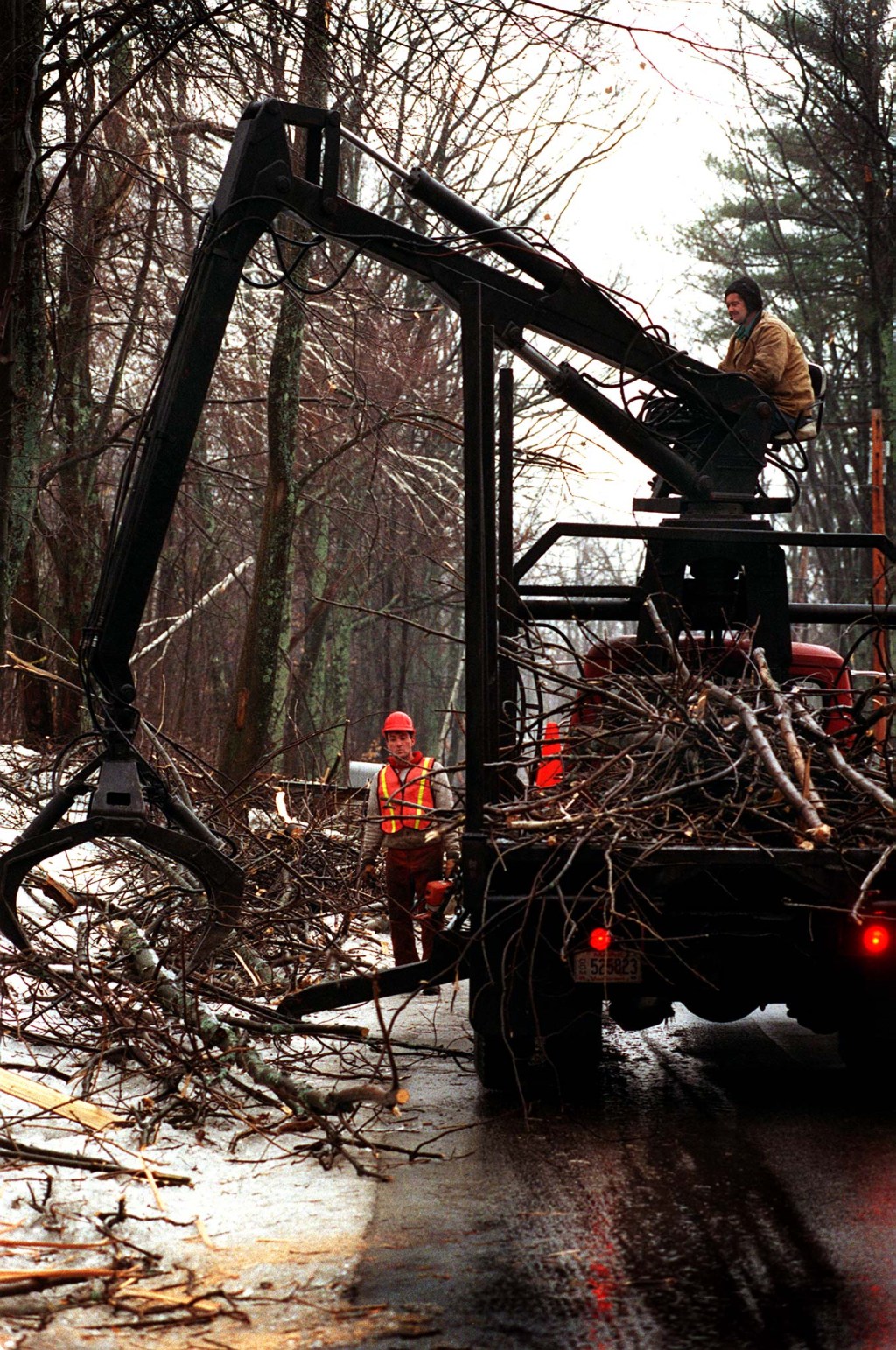 JAN. 13: Andrew Phelps and Mike Allenwood, from Chase Excavating, clear some of the thousands of downed tree limbs from Mountain Road, Falmouth, where they had been working for two days.