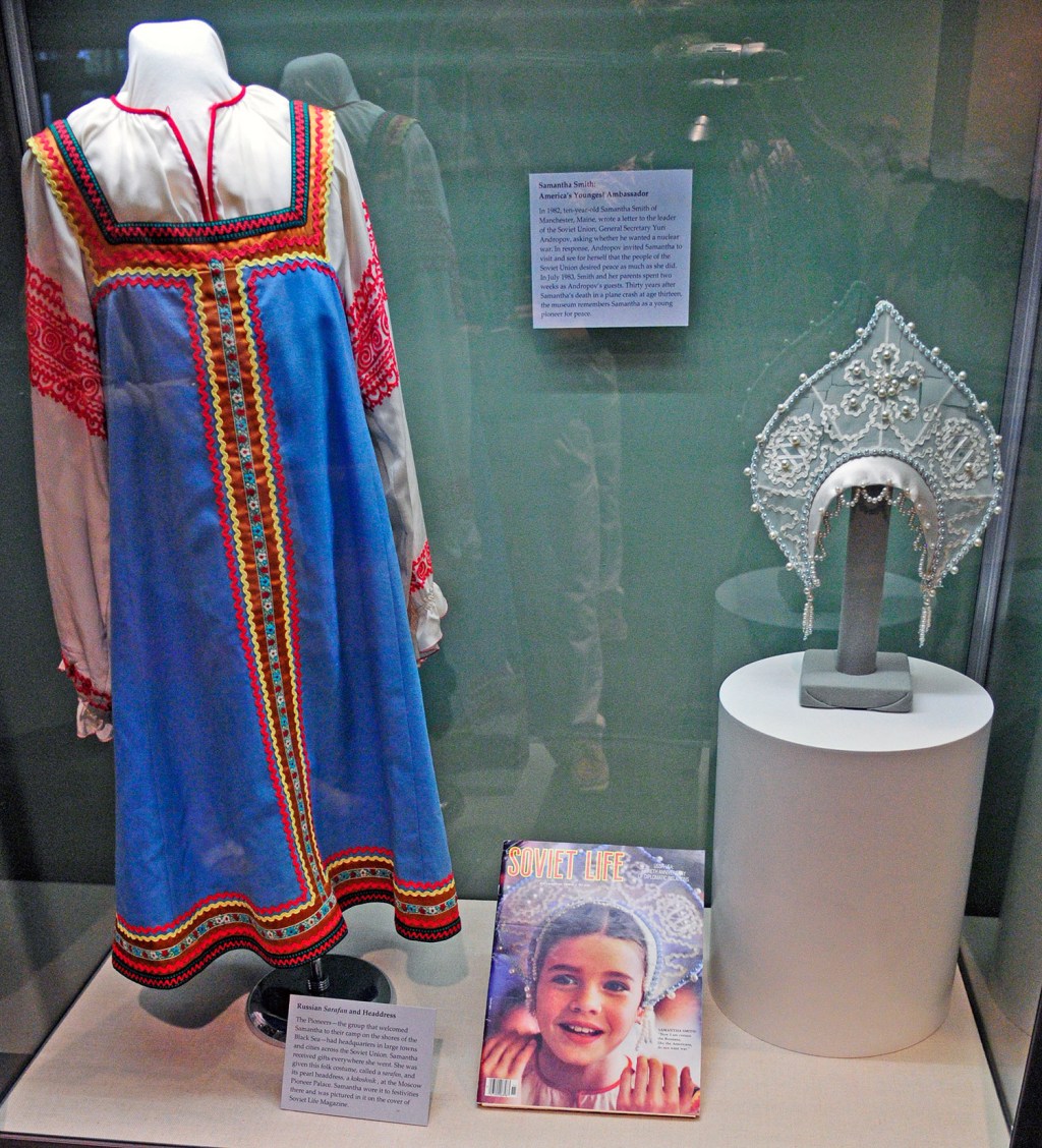 A traditional dress, called a sarafan, and headdress worn by Samantha Smith on her trip to the Soviet Union are on display at the Maine State Museum in Augusta. The Museum will also have a display of photographs from Smith's 1983 visit to the Soviet Union.