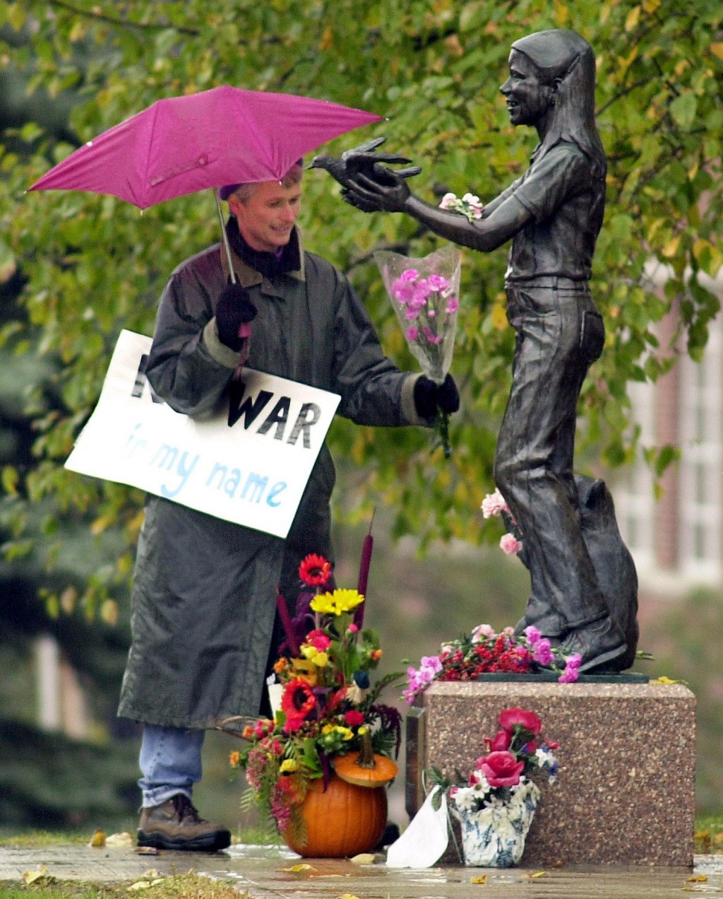Kathy Brammer of Saco places flowers at the statue of Samantha Smith during a 2002 anti-war protest in Augusta.