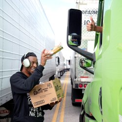 Dozens of trucks lined up outside Lewiston distribution center waiting to offload their cargo.