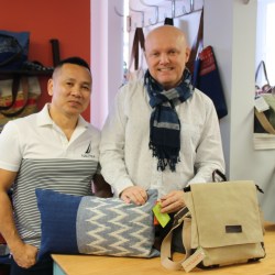 Locally designed fabric is handwoven in southeast Asia and returned as scarves, bags, more.