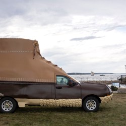 The L.L.Bean Bootmobile paid a weekend visit to South Portland's Bug Light Park, start of the city's Greenbelt Walkway, which will be upgraded with a donation from the Freeport-based company.