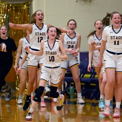 Stags' 11-game win streak snapped by Vikings, 61-50.